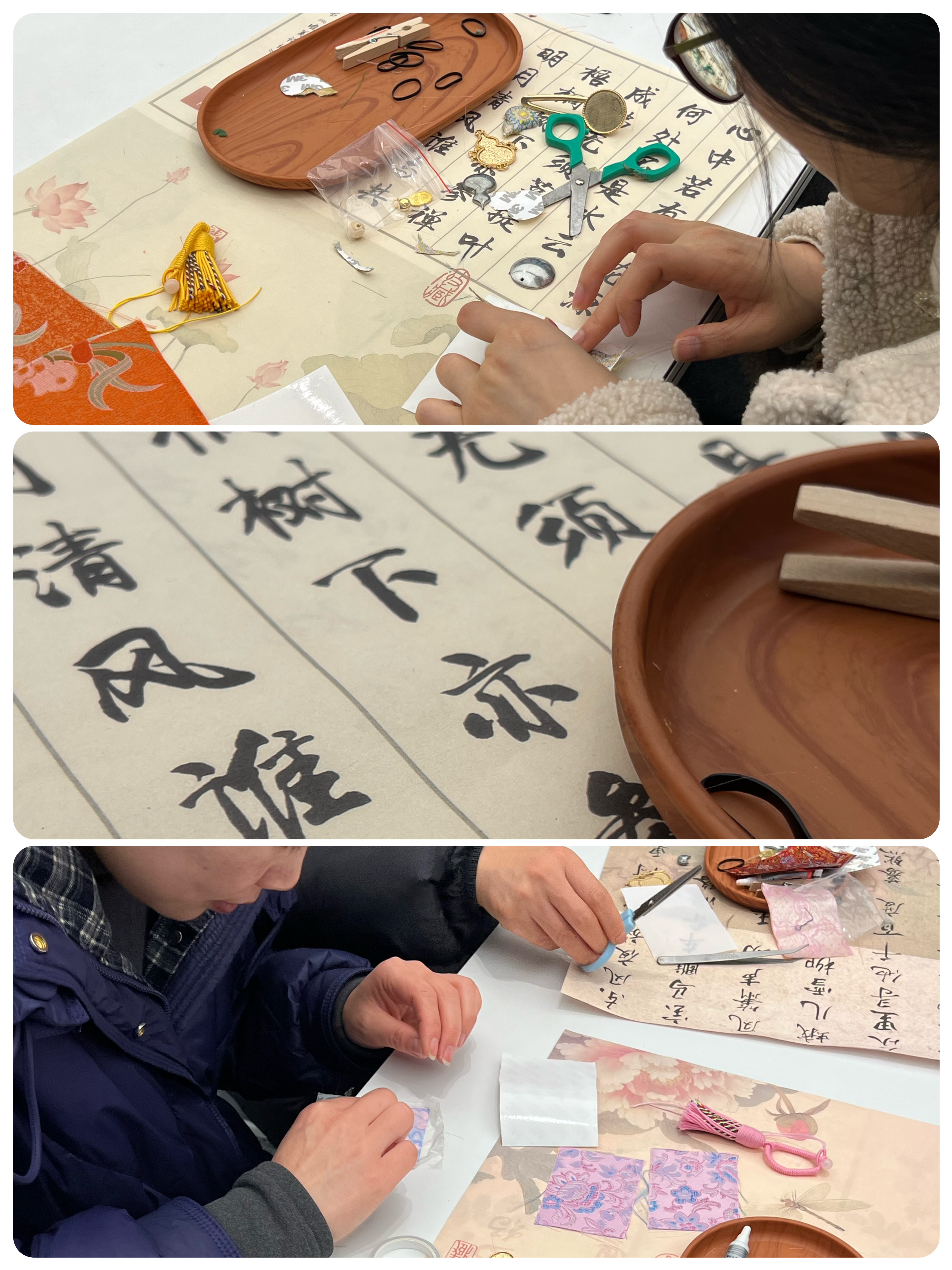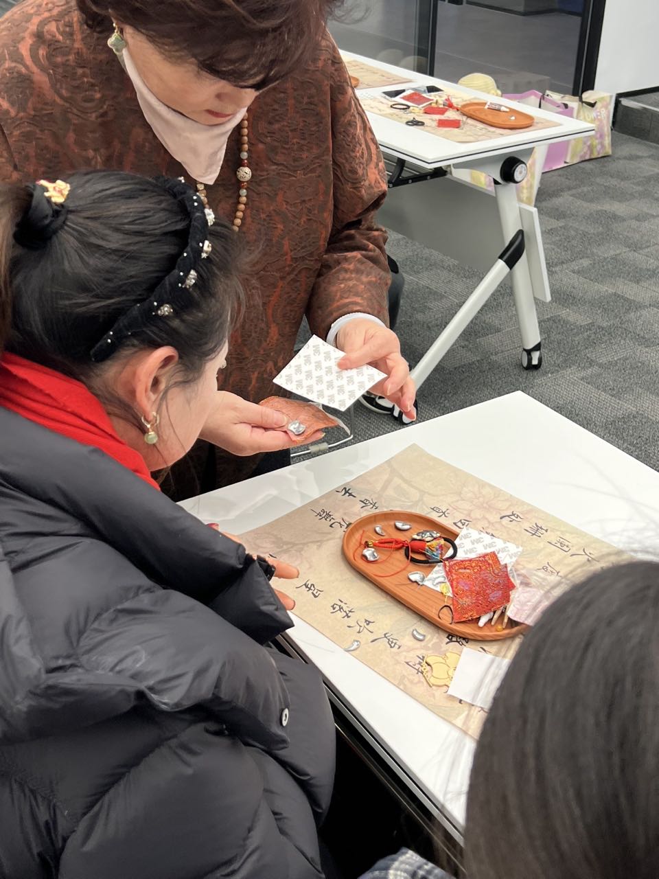 在老师的耐心指导下,女职工们从挑选锦片、裁剪定型,到搭配配饰、缝合点缀,一步步投入创作。大家专注凝神,指尖抚过细腻的锦缎,感受着千年技艺的温度,现场氛围温馨而热烈。原本沉寂的锦片,在大家的巧手下,逐渐变成了精致的宋锦挂件、雅致的胸针,每一件作品都融入了个人的巧思与心意,不仅展现了女职工们的心灵手巧,更让大家在亲身实践中,读懂了非遗文化的匠心与魅力,实现了传统美学与现代生活的美好碰撞。
