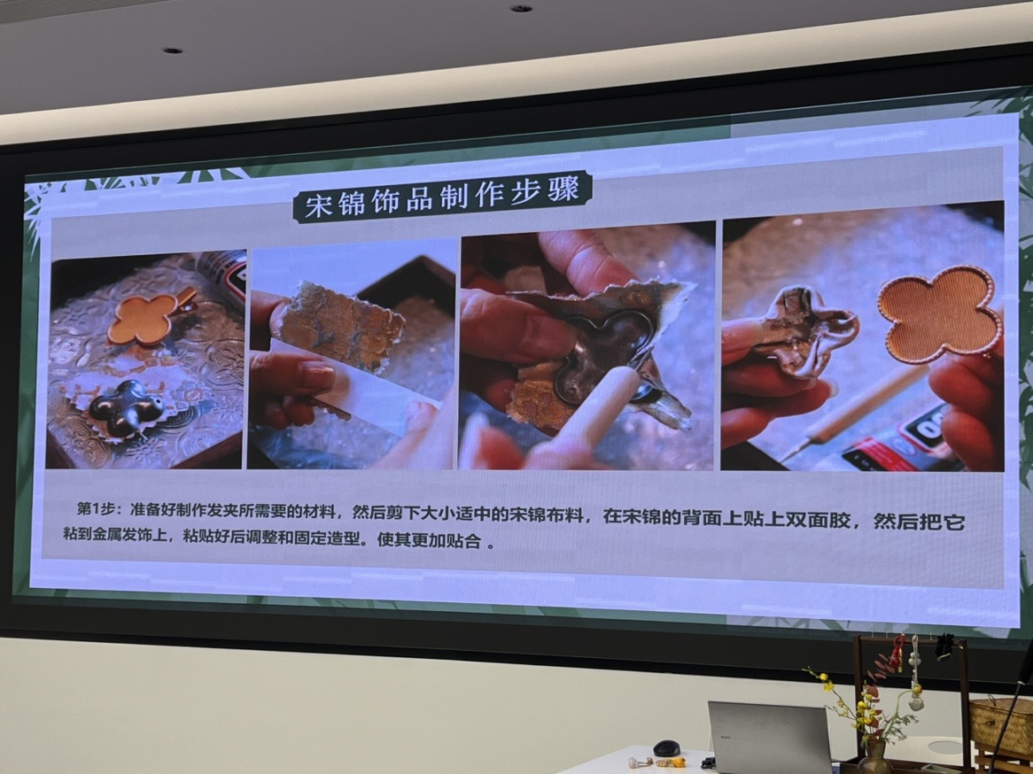 活动现场,非遗宋锦体验区早已布置妥当,一卷卷色泽温润、纹样精巧的宋锦面料整齐陈列,精致的金属配件,瞬间将大家带入千年锦韵的雅致氛围中。宋锦起源于宋代,以“通经断纬”的复杂工艺织造而成,素有“寸锦寸金”的美誉,其色泽古朴、质地紧密、图案纤巧,承载着中华传统文化的深厚底蕴。