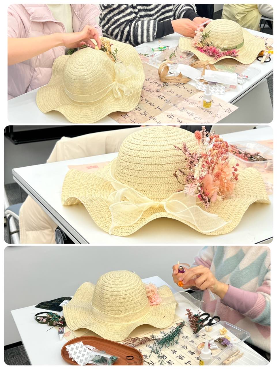 法式礼帽的DIY,同样充满了浪漫气息。蕾丝、网纱、缎带、花朵等装饰材料琳琅满目,专业讲师细致讲解了礼帽的制作技巧,从褶皱造型、花朵点缀,每一个步骤都讲解的通俗易懂,让大家快速掌握创作要领。